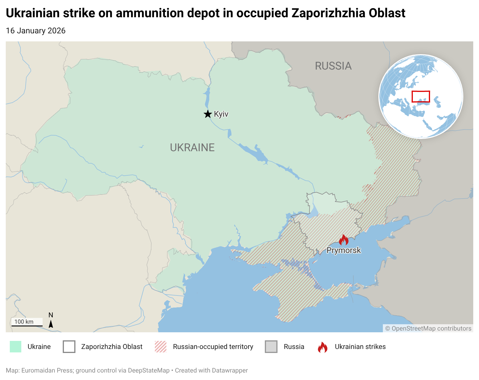 Ukraine’s Defense Forces struck a Russian ammunition depot in occupied Zaporizhzhia Oblast overnight on 16 January, the General Staff of Ukraine’s Armed Forces reported.