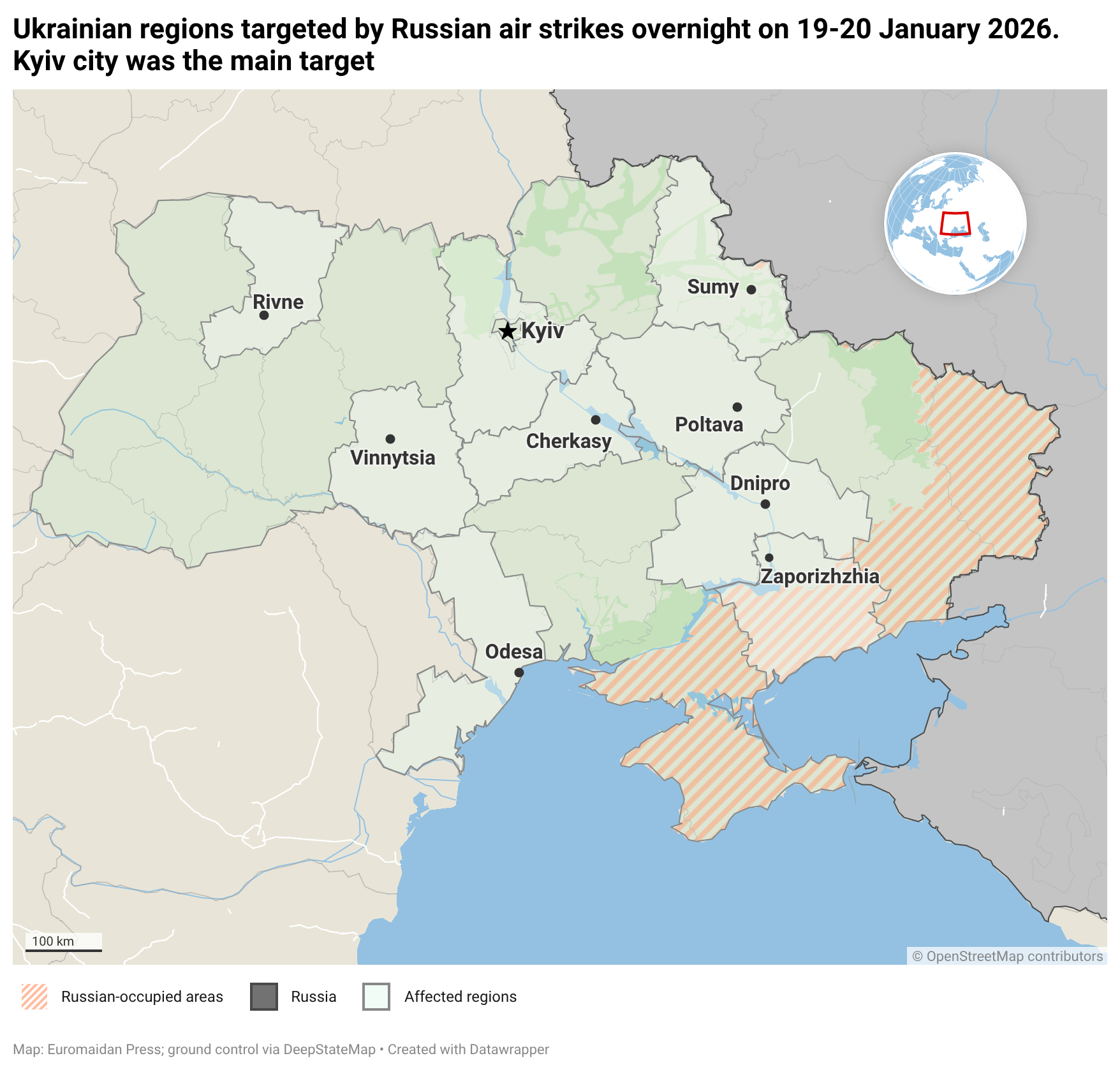 According to the President, the worst-hit area was Ukraine's capital, Kyiv city, where a large number of residential buildings were left without heating. Among other affected regions, he named the oblasts of Kyiv, Vinnytsia, Dnipto, Odesa, Zaporizhzhia, Poltava, and Sumy, along with other unnamed regions.