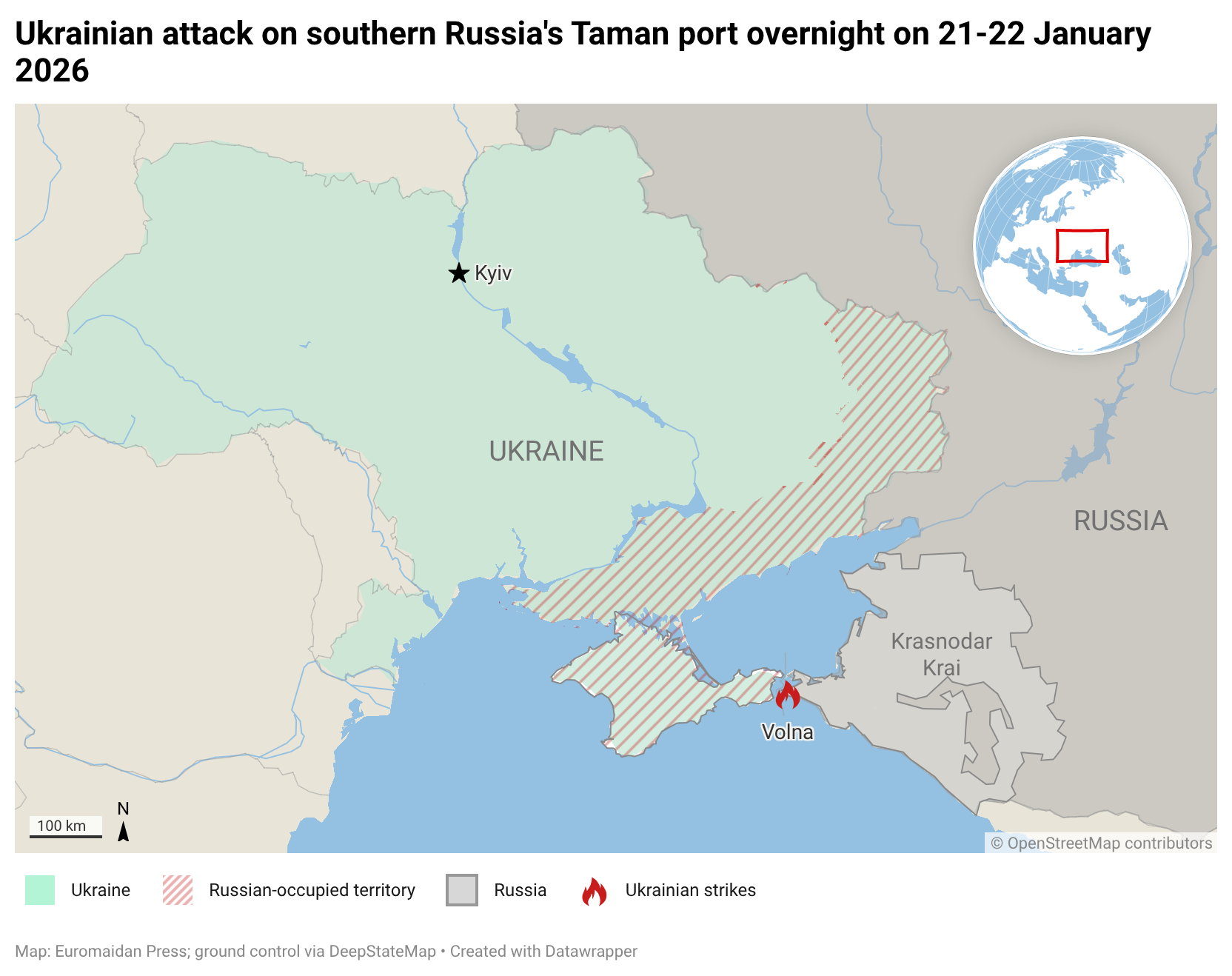 Another confirmed Ukrainian strike occurred overnight on 31 December, hitting two oil pier structures at the terminal near Volna.
