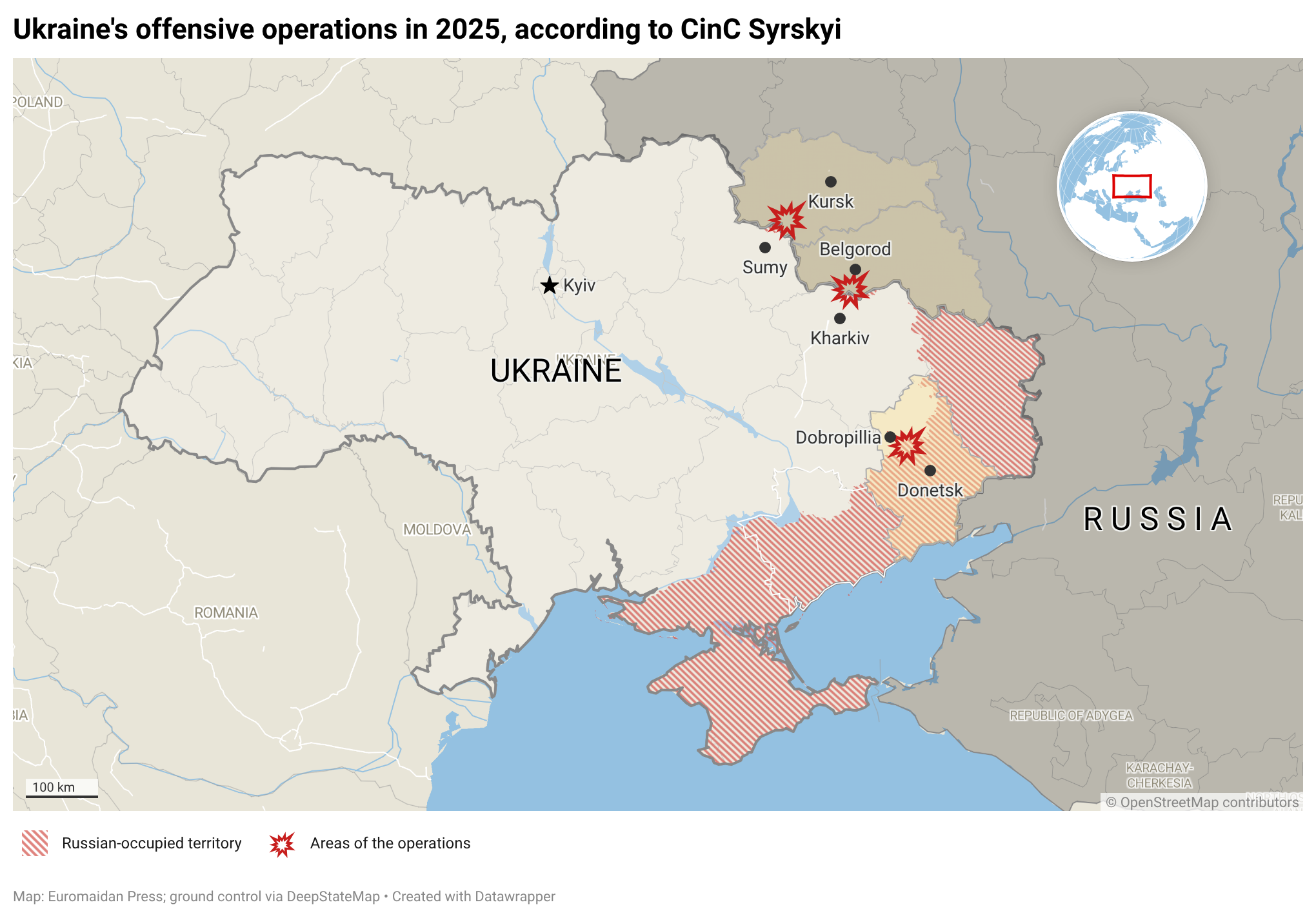 "In 2025, Ukraine's Defense Forces conducted three offensive operations, two of which were on Russian territory: in [Russia's] Belgorod Oblast and in Kursk Oblast. The third operation took place in the Dobropillia direction."