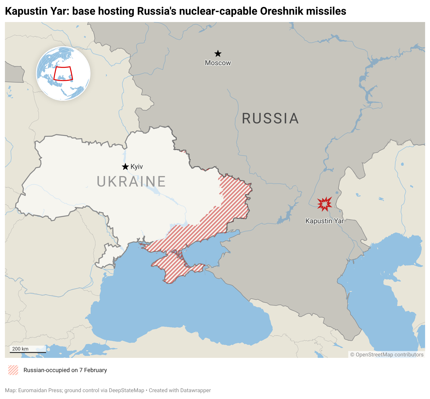 Ukraine confirmed damage to ballistic missile infrastructure at Russia's Kapustin Yar test range from previous strikes. The range in Astrakhan Oblast is the launch site for Russia's Oreshnik intermediate-range ballistic missiles (IRBM), fired at Ukraine twice.