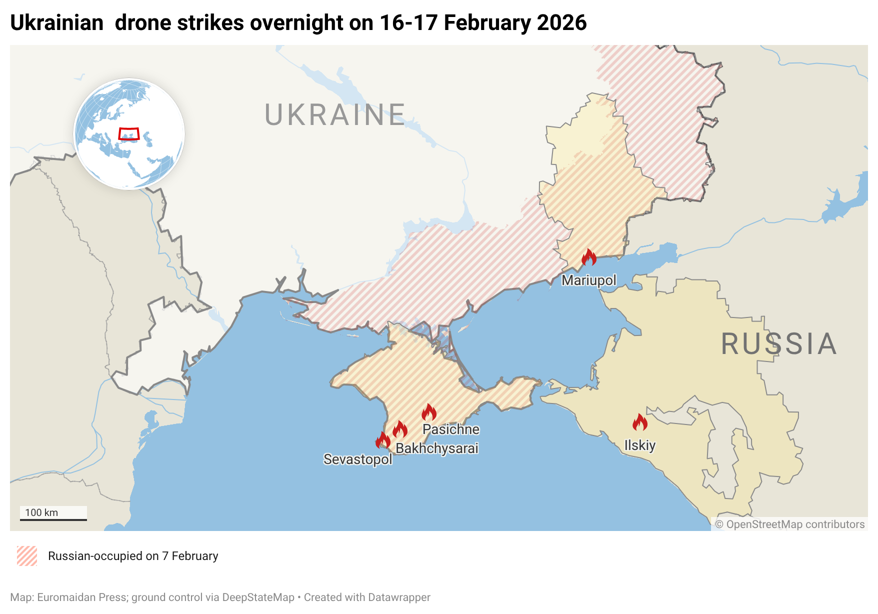 Drones struck the Ilsky oil refinery in southern Russia's Krasnodar Krai and triggered sirens and a blackout near Russia's Baltic Fleet base in Vyborg overnight on 16–17 February. Russia's defense ministry claimed it intercepted 151 Ukrainian drones across multiple areas.