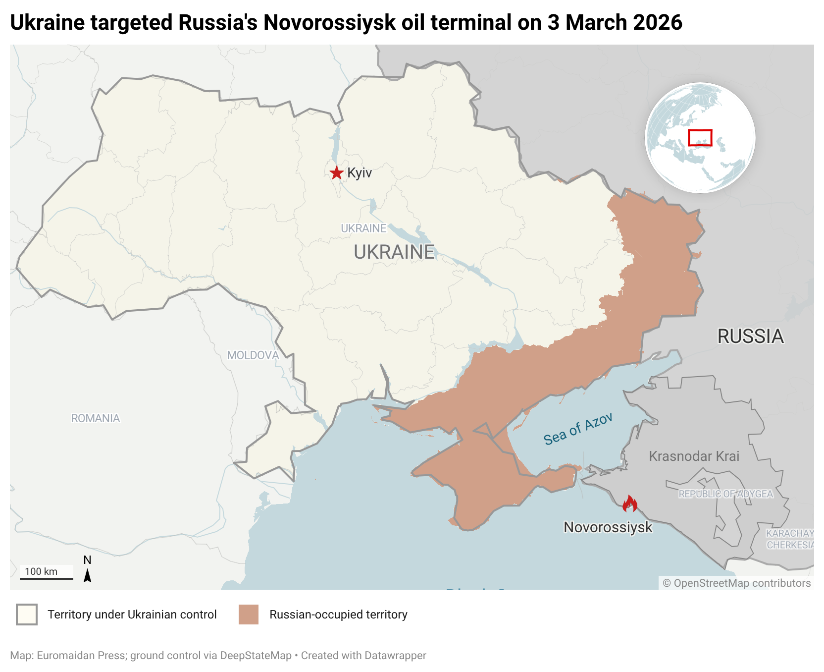 A fire broke out overnight on 2 March at the Sheskharis oil-loading terminal in Russia’s Black Sea port of Novorossiysk after a Ukrainian drone attack, Militarnyi reported. The outlet cited OSINT analysis by the Russian Telegram channel Astra, which reviewed eyewitness footage and local chat messages describing explosions and a blaze in the port area.