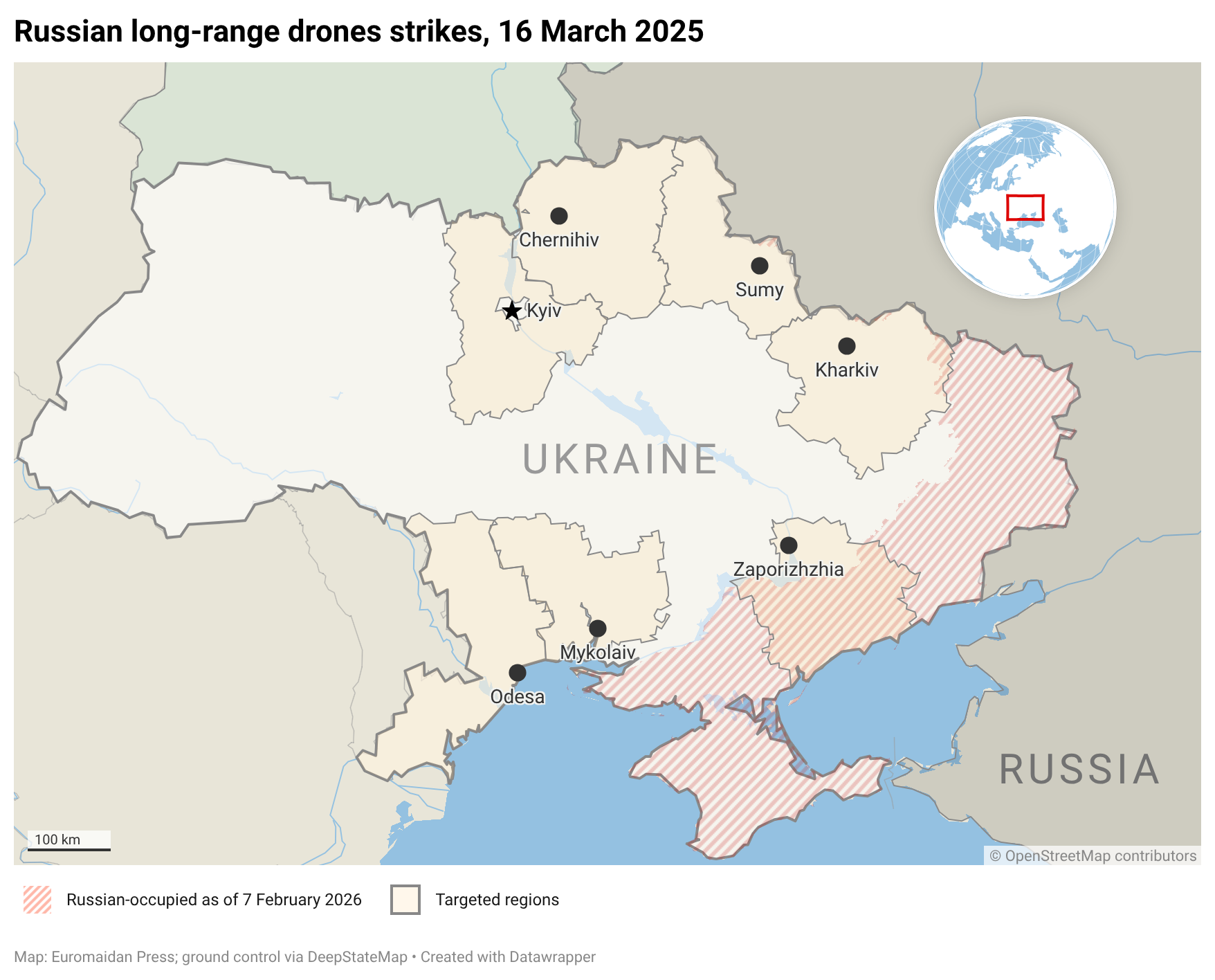 Russia launched 211 drones against Ukraine overnight and into the morning of 16 March, with Ukraine's Air Force reporting the main attack directions as Odesa, Zaporizhzhia, and Kyiv oblasts. Local authorities separately confirmed strikes on Kharkiv and Mykolaiv. The Air Force noted that Shahed, Gerbera, and Italmas drones — over 100 of them Shaheds — were fired from six directions: Oryol, Kursk, Bryansk, Millerovo, and Prymorsko-Akhtarsk in Russia, and Hvardiyske in occupied Crimea. By 11:00, 194 drones had been downed or suppressed, but 16 struck 10 locations. Ukraine's Air Force flagged the morning wave targeting Kyiv as "atypical," an unusual pattern in Russia's strike timing that underscores a broader escalation of Russia's drone campaign against Ukrainian cities and infrastructure.