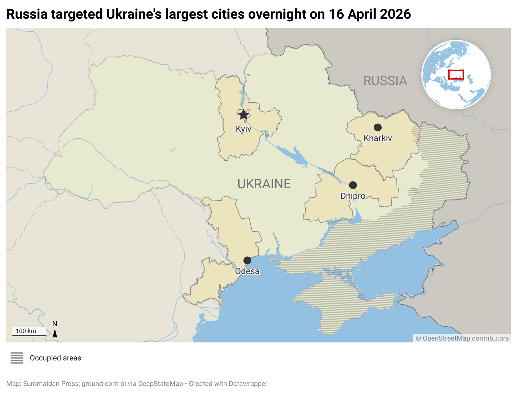Russia killed at least 16 and injured more than 100 civilians across four cities from the afternoon of 15 April through the morning of 16 April, regional officials and local emergency services reported. Ukraine's Air Force intercepted 667 of 703 incoming missiles and drones over the past afternoon and night, yet 32 still reached their targets, hitting 26 locations.