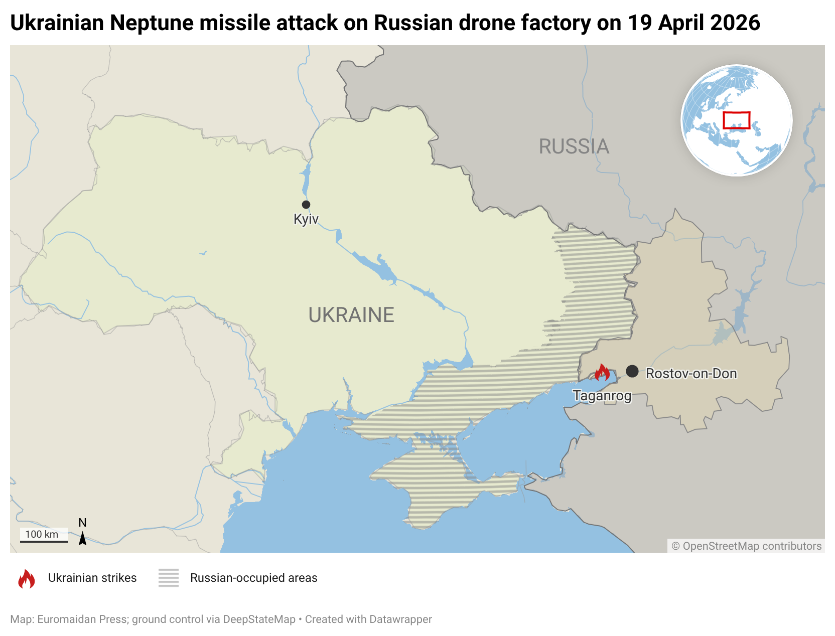 Ukraine's Naval Forces struck a Russian drone factory in Taganrog, Rostov Oblast, with Neptune cruise missiles overnight on 19 April, according to the Ukrainian Navy's Telegram channel. The same overnight operation also hit ammunition depots, logistics warehouses, and fuel infrastructure across occupied Ukrainian territory, the General Staff reported.