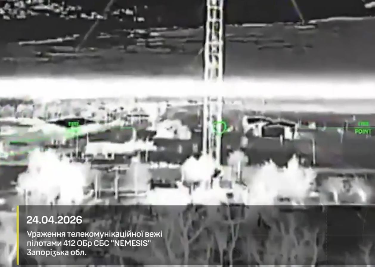 - On 24 April, the 20th SBS Brigade "K-2" used two drones to destroy a Russian logistics hub in occupied parts of Luhansk Oblast. The same day, the 412th SBS Brigade NEMESIS struck a communications tower in Zaporizhzhia Oblast — the structure collapsed completely.