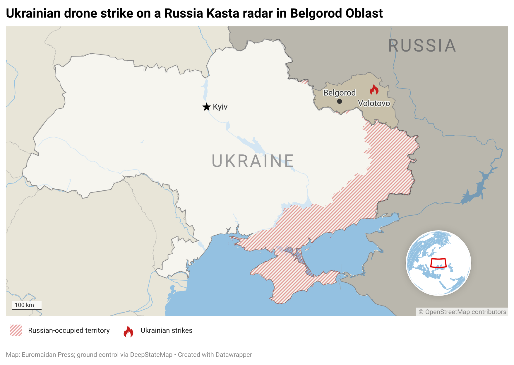 Ukrainian drone pilots from the 429th Achilles Brigade burned a Russian Kasta-2E radar near the village of Volotovo in Belgorod Oblast, brigade commander Yurii "Achilles" Fedorenko posted on Telegram on 27 April. The site sits about 80 km from Ukraine's state border. The approximate value of the destroyed system is around $60 million, Army Inform noted.